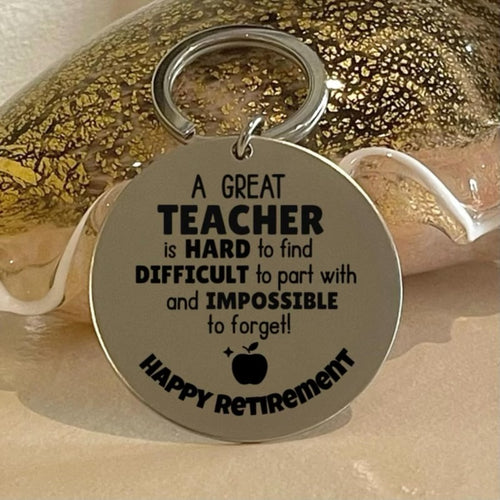 "A great Teacher is hard to find, difficult to part with, and impossible to forget! Happy Retirement" Keychain